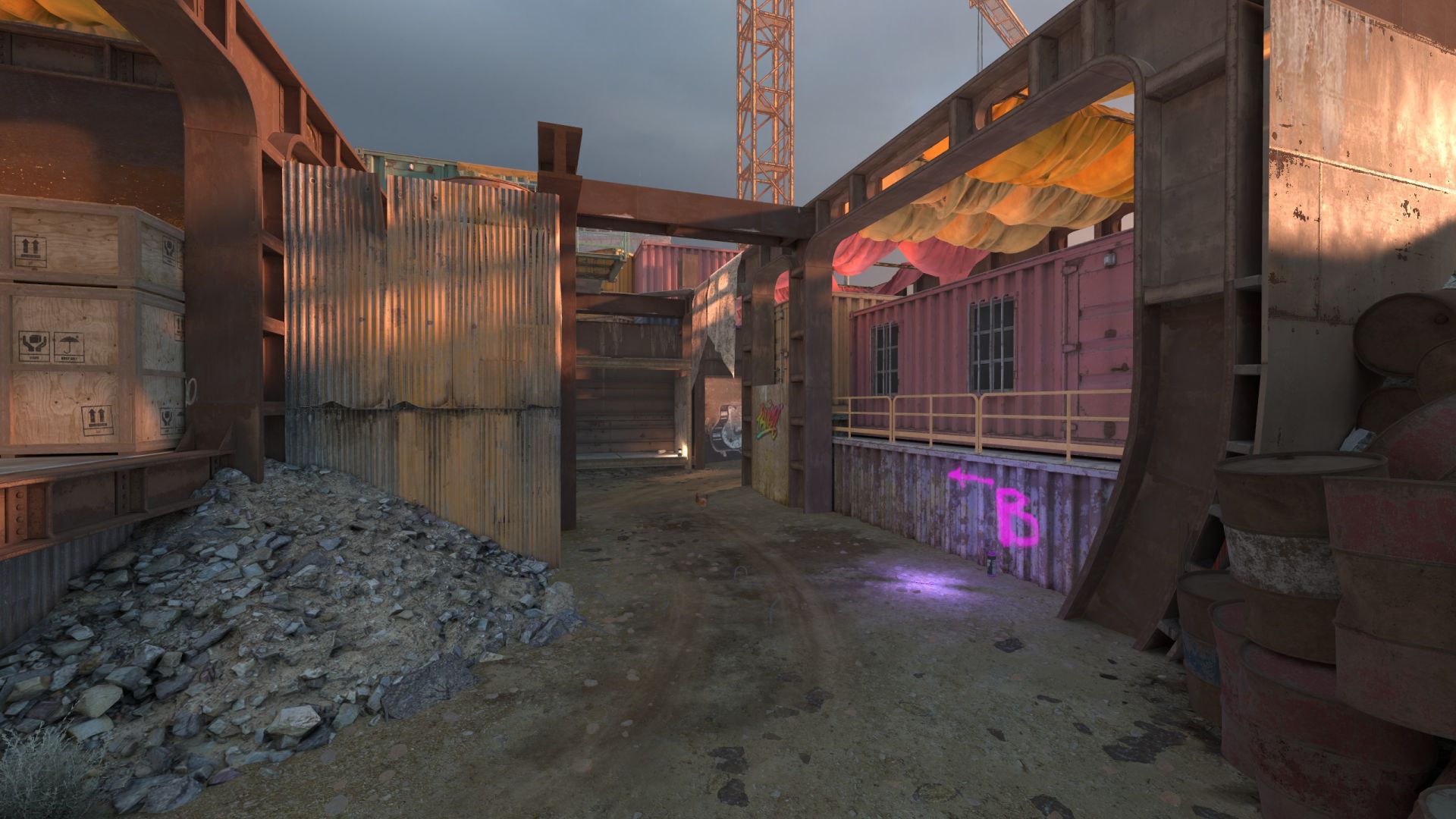 Orientieren kann man sich übrigens am Kran, der einen zu Bombenplatz B führt. Leider ist dieser Spot optisch ziemlich langweilig. Es ist einfach eine etwas größere Fläche inmitten der Container. Ohne die entsprechende Markierung würde man wahrscheinlich gar nicht realisieren, dass hier die Bombe gelegt werden soll. Auf der anderen Seite der Map wird dieses Problem durch das namensgebende, zerstöre Schiff verhindert.