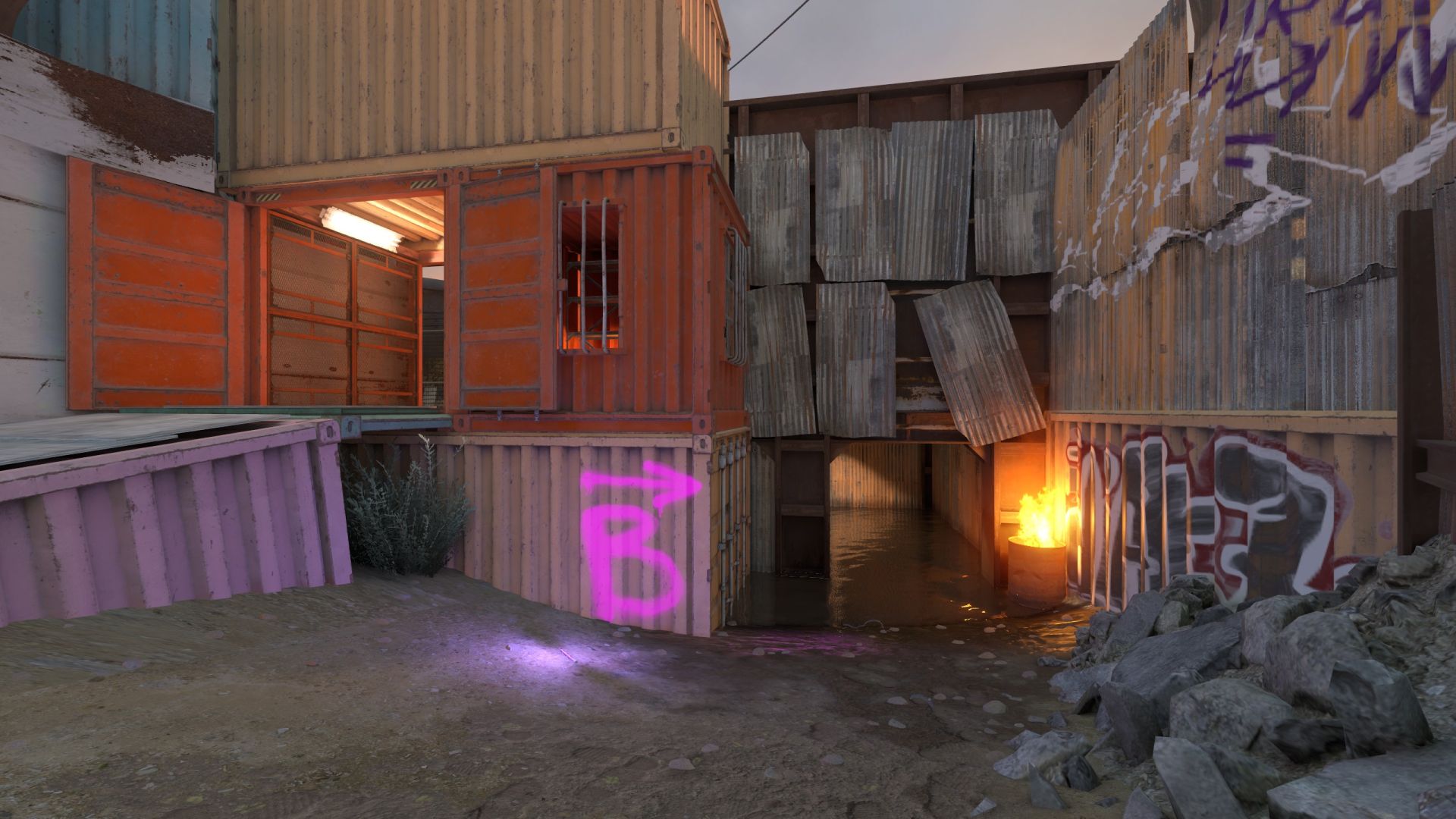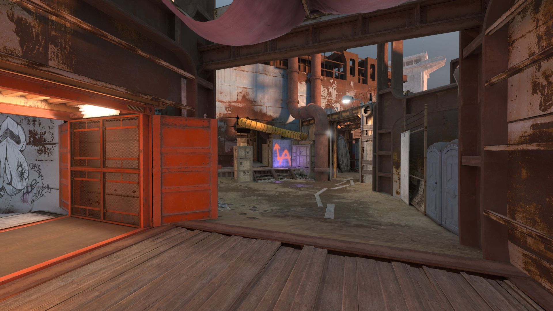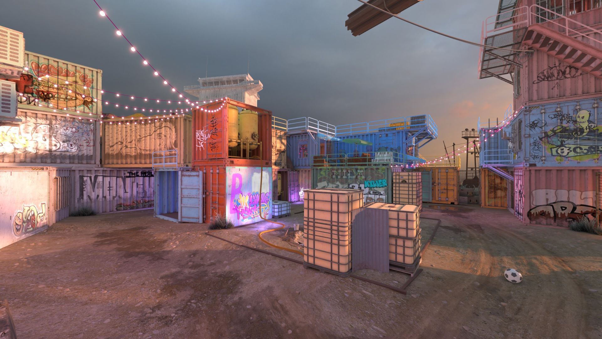 Nicht nur, dass auch das Innenleben der Schiffswracks glaubwürdig gestaltet werden musste. Es darf natürlich auch nicht an Abwechslung fehlen und das Ganze muss sich am Ende möglichst gut spielen. Um das Schiffswrack herum befindet sich deshalb eine Containersiedlung, in der sich laut Mapbeschreibung Anarchisten niedergelassen haben. Die wirklich vielen Container formen die Routen und ein fragwürdiges Chemielabor innerhalb der Schiffstrümmer dient als Bombenplatz. Thematisch passend wirkt alles wie eine Müllhalde. Eine bunte Müllhalde, auf der Schiffe entsorgt werden.